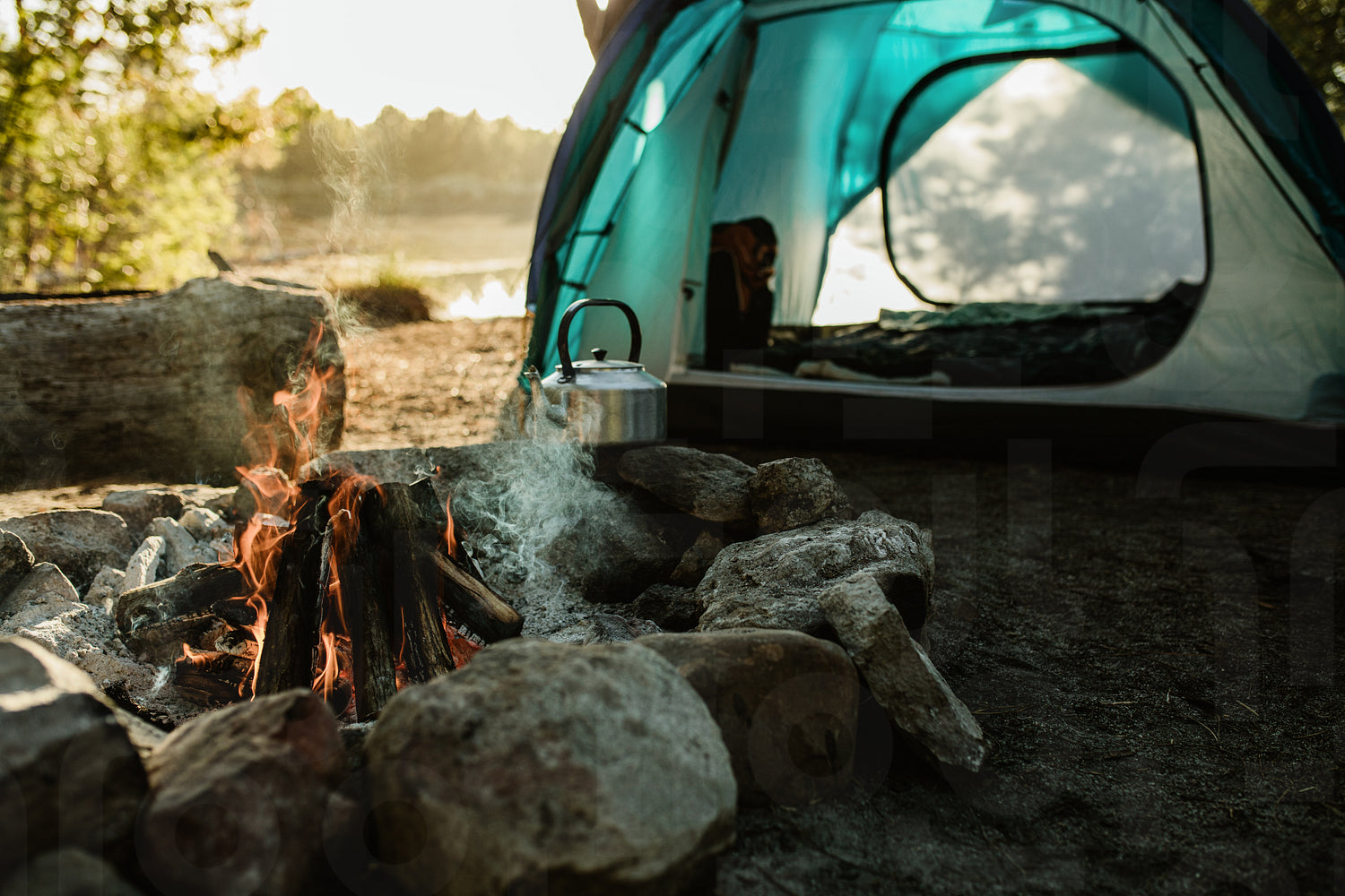 Campsite with a tent, kettle and burning fire pit in countryside. Camping by a lake in forest.