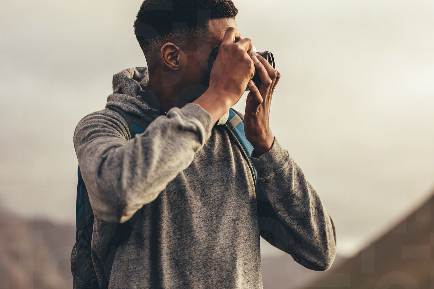 Young african man taking pictures of beautiful landscape with his digital camera. Man shooting new content for his social media.