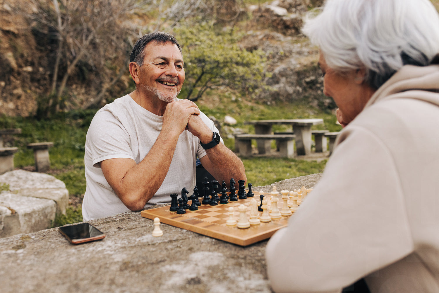 Carefree elderly couple enjoying a game of chess in a park