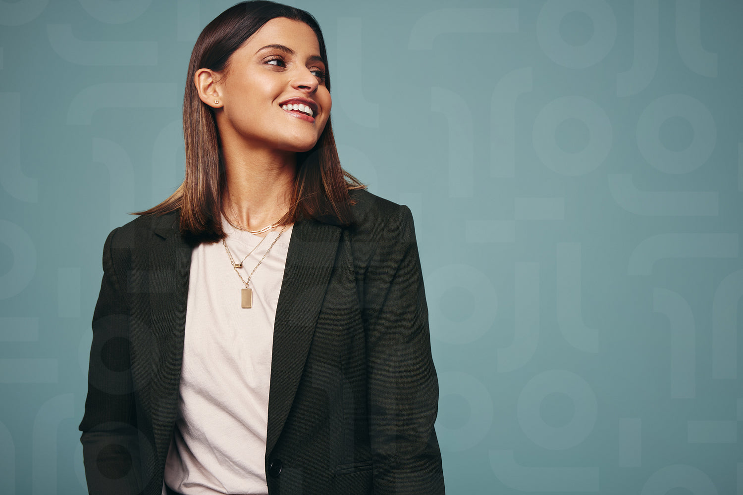 Carefree young woman looking away with a smile on her face. Strong independent woman standing alone against a studio background. Self-confident young woman feeling empowered.