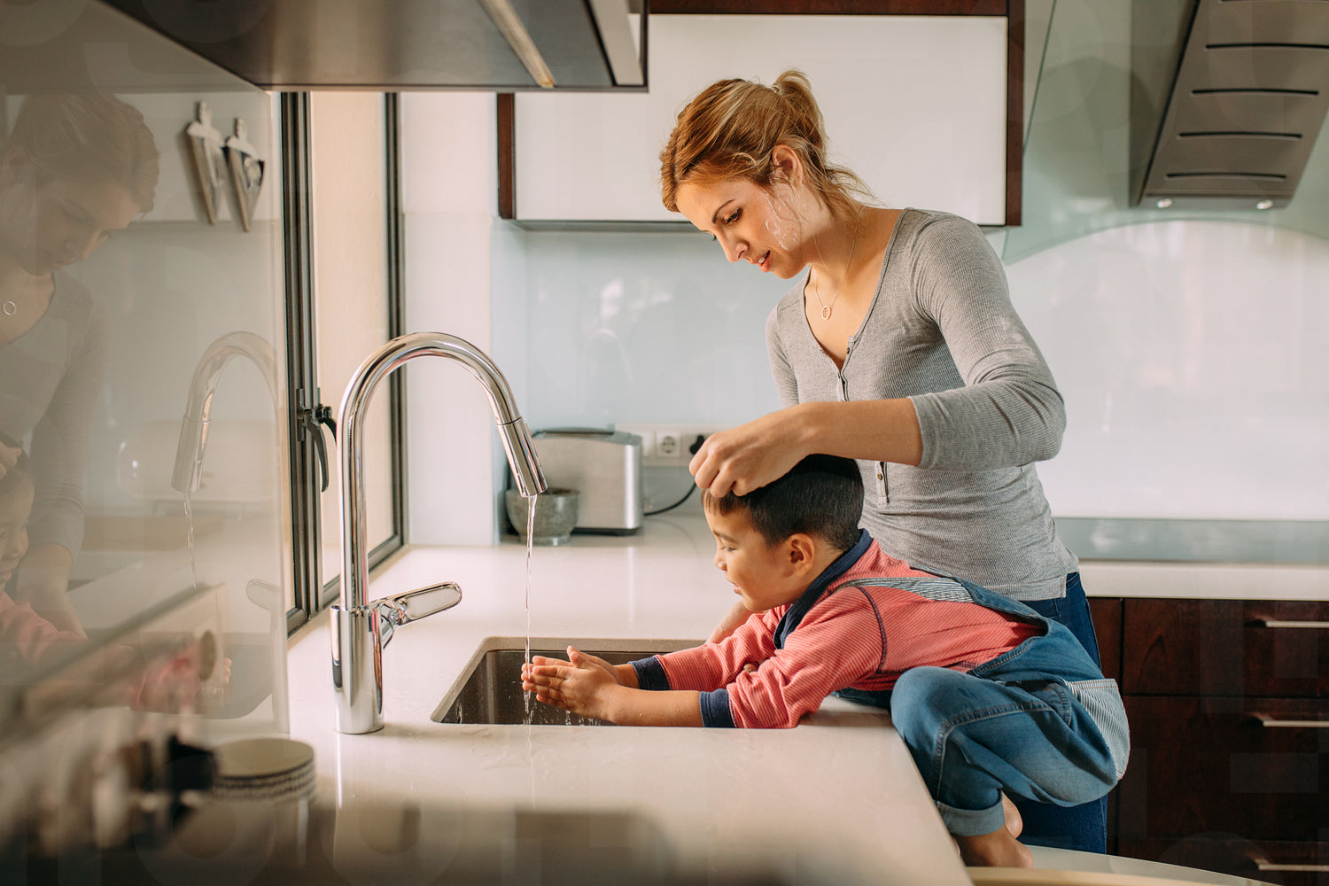 Caring mother and kid wash hands in a sink at kitchen. Small boy with mother washing hands under kitchen sink faucet.