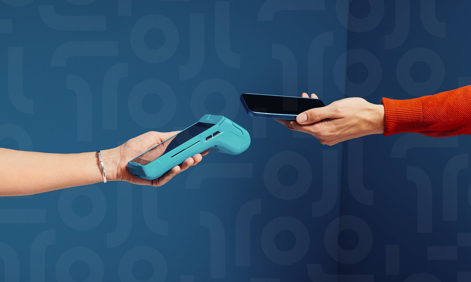 Hands holding a smartphone and a POS terminal, demonstrating cashless payment, digital wallet usage, and modern finance through internet banking.