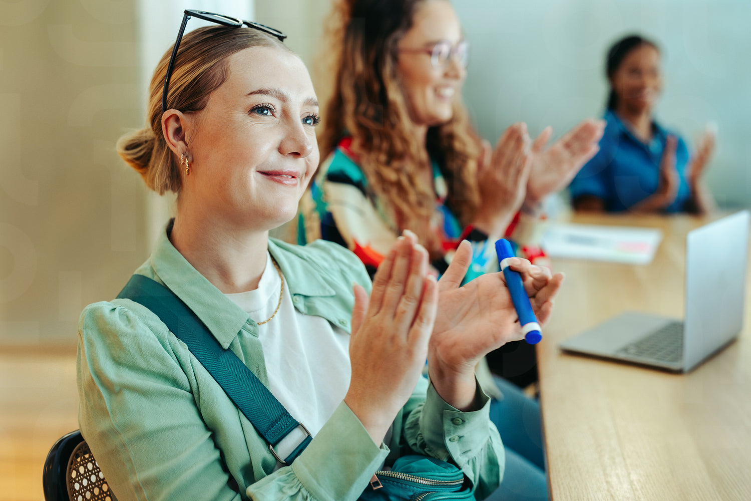 A group of marketing professionals in a casual meeting setting, engaged and applauding. The scene conveys teamwork and appreciation within a modern office environment.