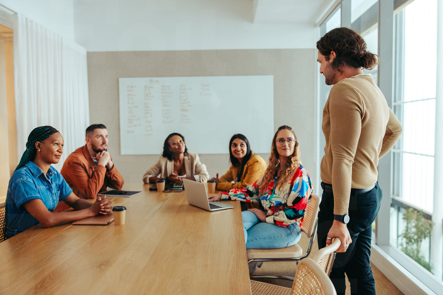 A caucasian businessman is addressing a diverse group of colleagues around a conference table. They are engaged in a professional discussion, collaborating on new strategies and ideas.