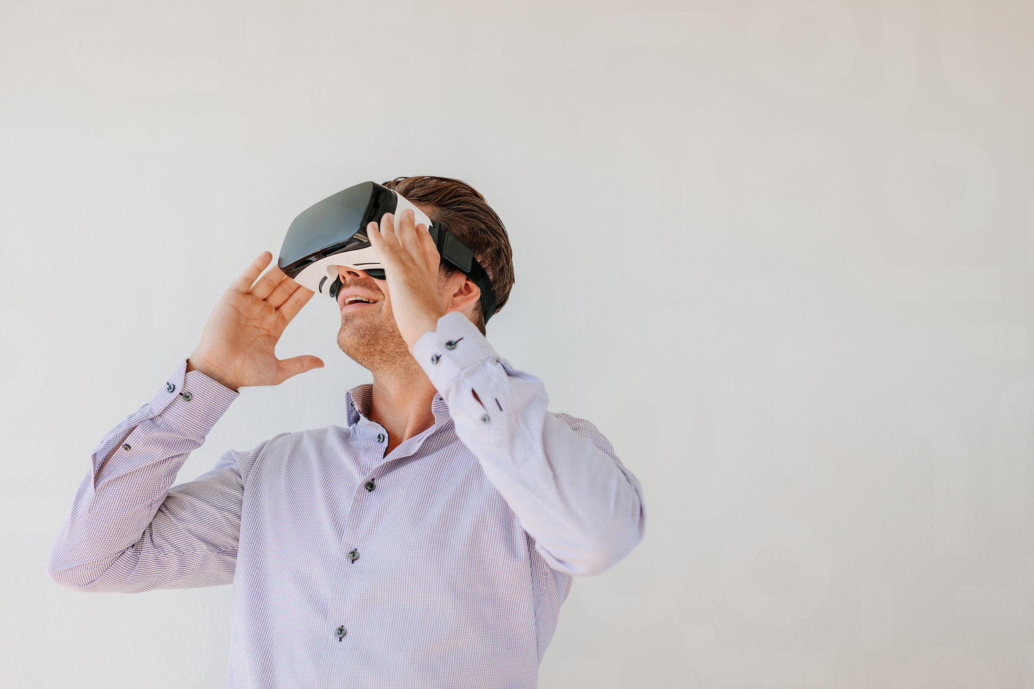 Happy young man using the virtual reality headset against grey background with copy space. Caucasian male model wearing VR goggles.