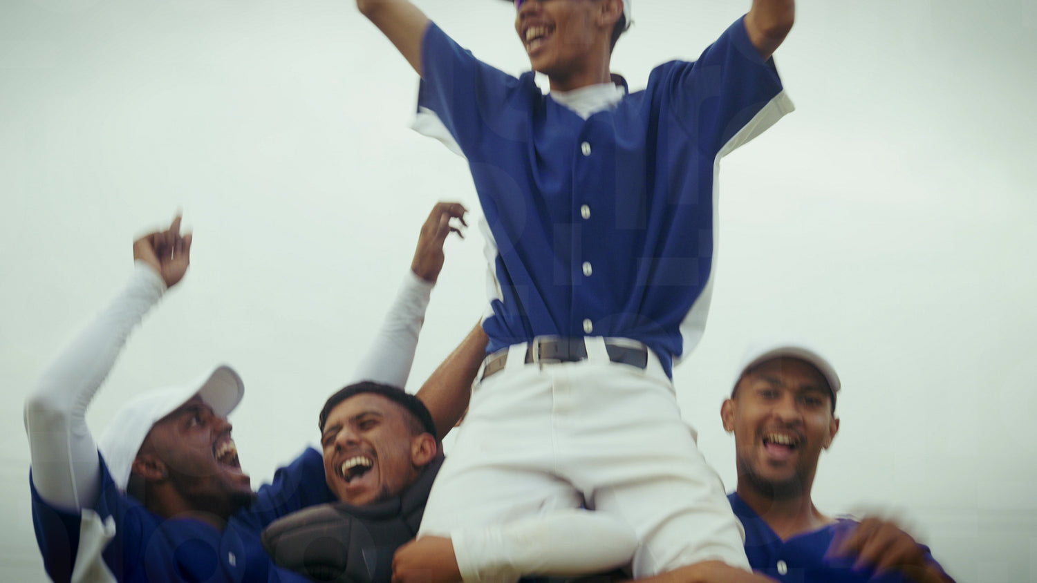 Victorious baseball players joyfully celebrate their win, lifting a teammate on their shoulders with cheers and raised arms. A display of unity and success.