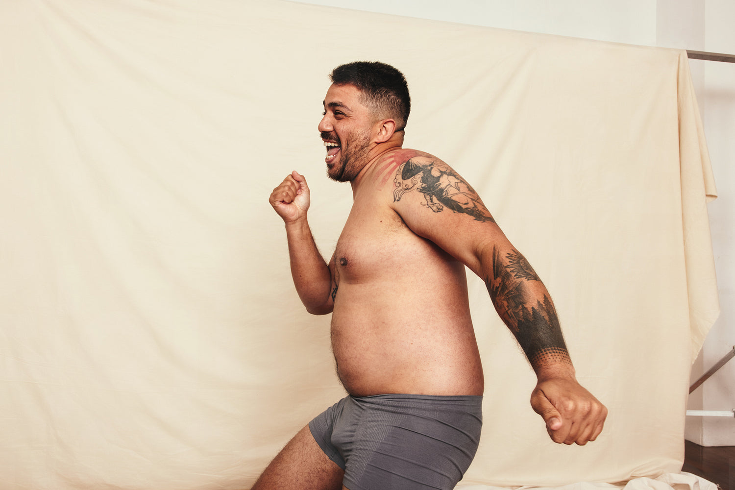 Celebrating being natural. Happy shirtless man dancing cheerfully while wearing grey underwear and standing against a studio background. Body positive and self-confident man embracing his own body.