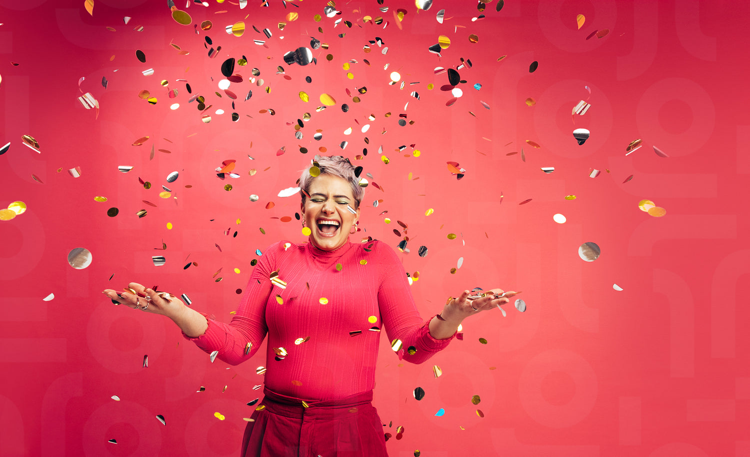 Celebrating with confetti. Carefree young woman getting excited while standing under falling confetti in a studio. Vibrant young woman having fun and celebrating life against a red background.
