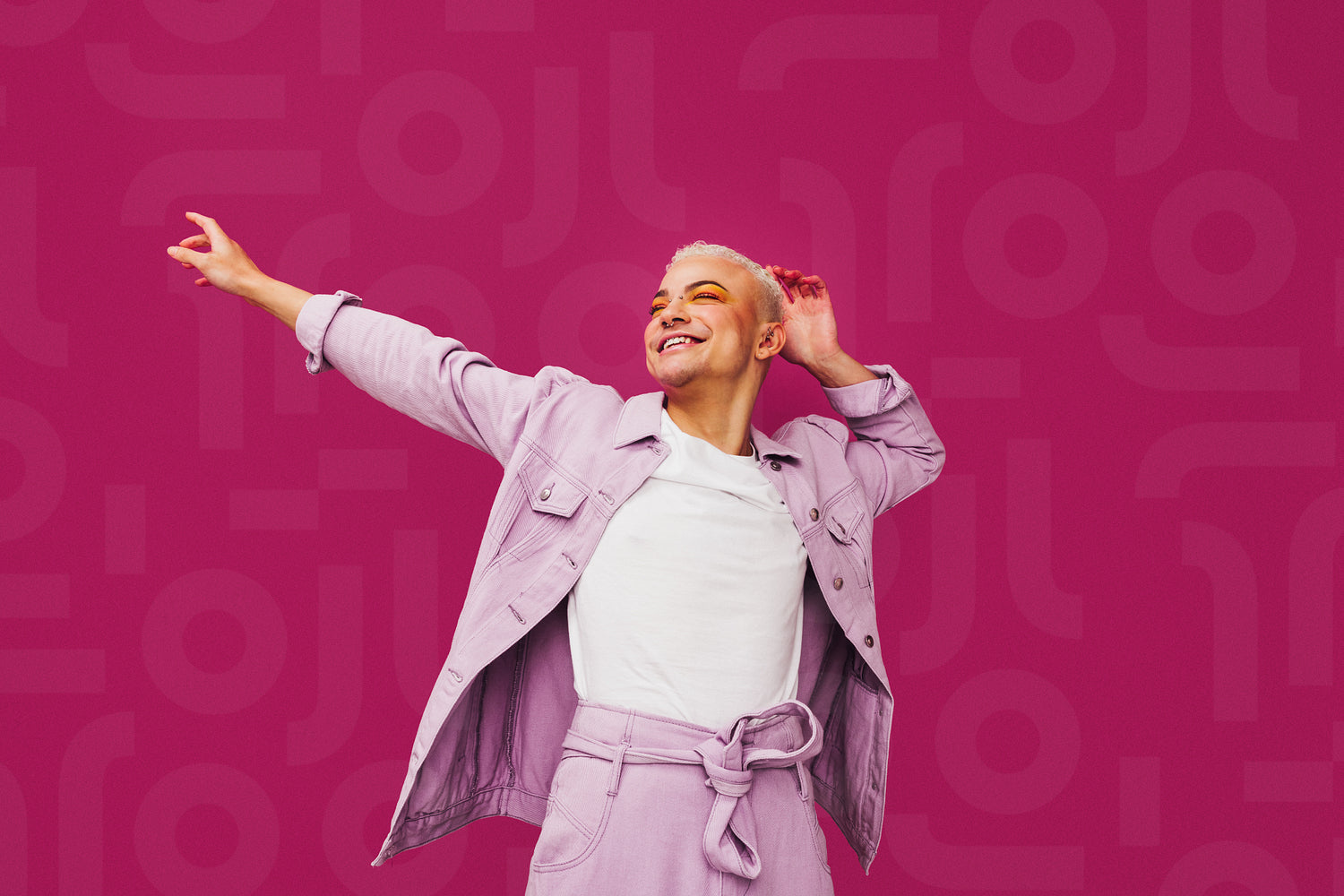 Celebrating the beauty of life. Happy queer man celebrating with his arms outstretched in a studio. Cheerful non-conforming man smiling while standing against a purple background.