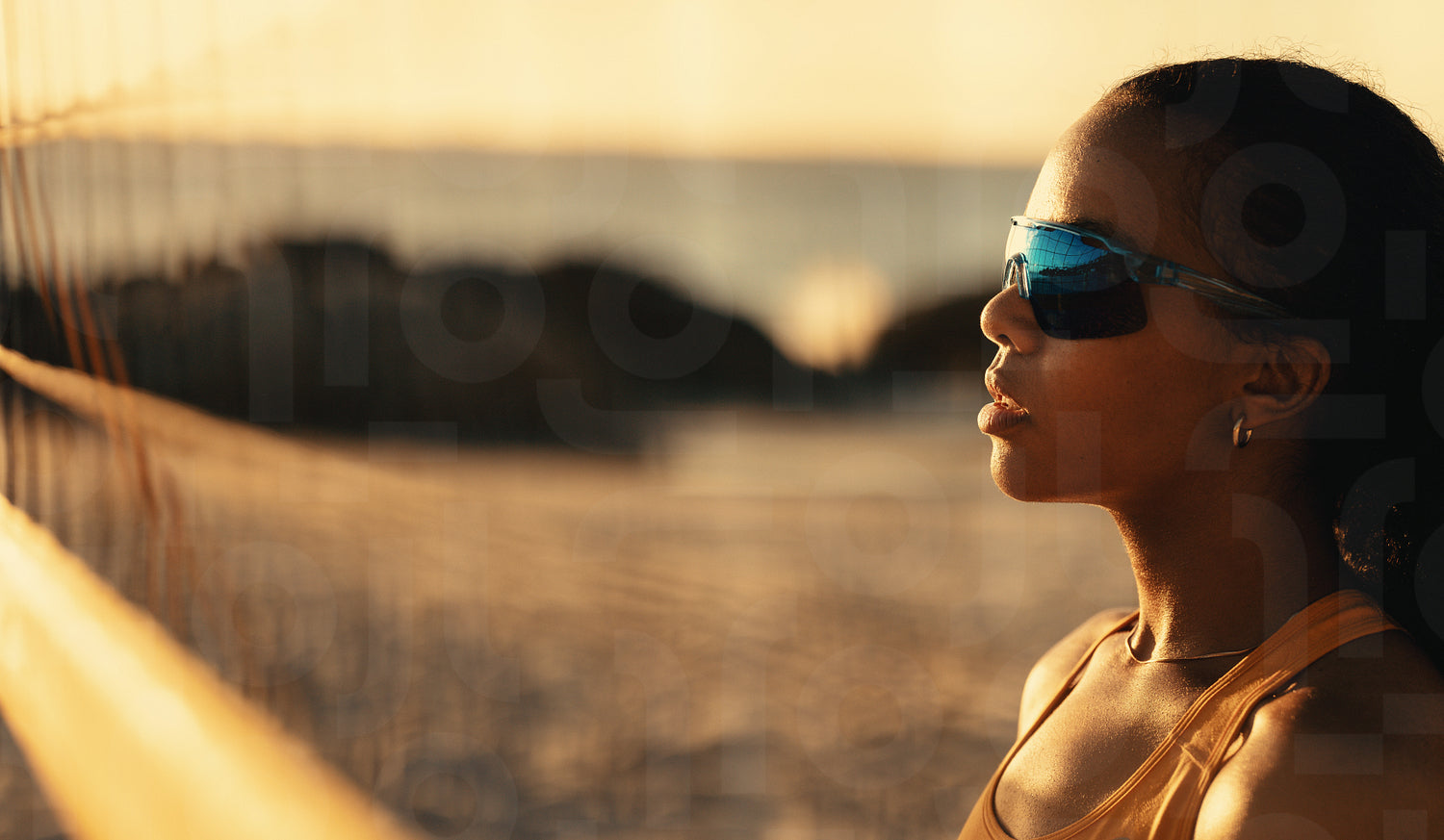 A young female athlete competes in a beach volleyball championship at sunset. She wears polarized sunglasses while playing on a sandy court, showcasing her skill and determination.
