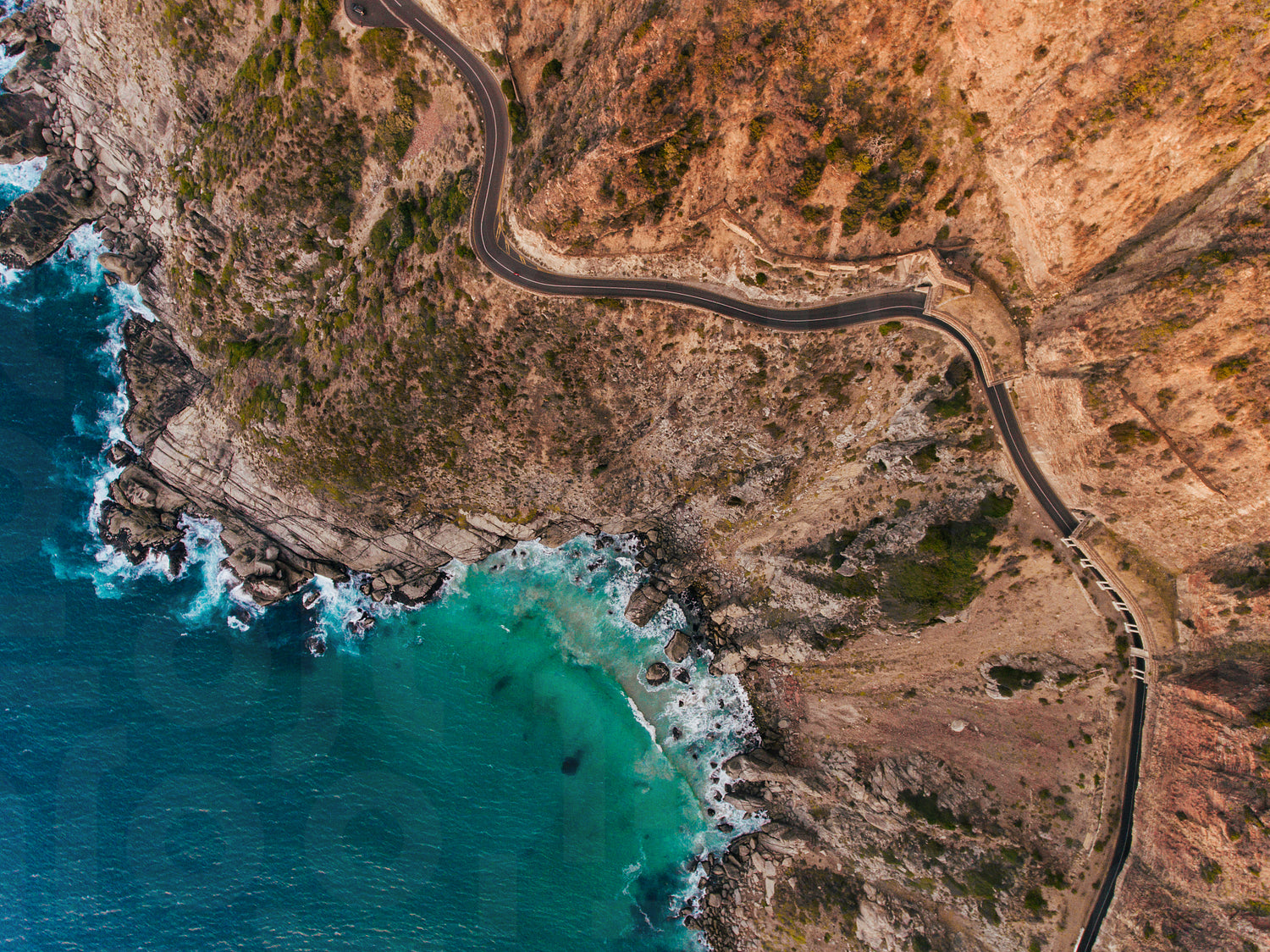 Aerial view of road going through beautiful landscape. Rocky scenery close to the ocean.