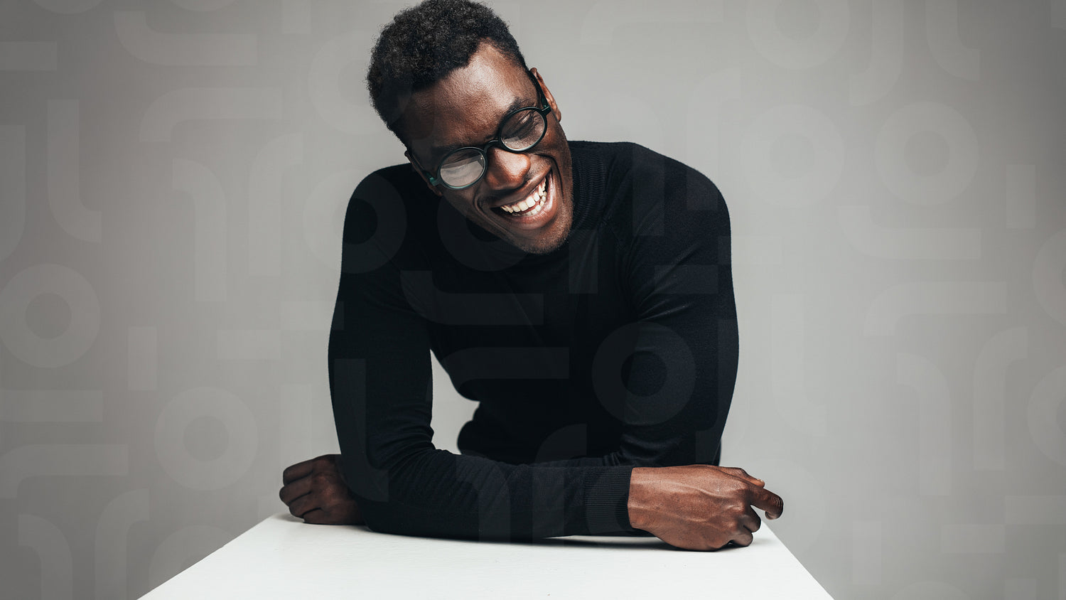 African man sitting at table and smiling. Relaxed young guy against gray background.