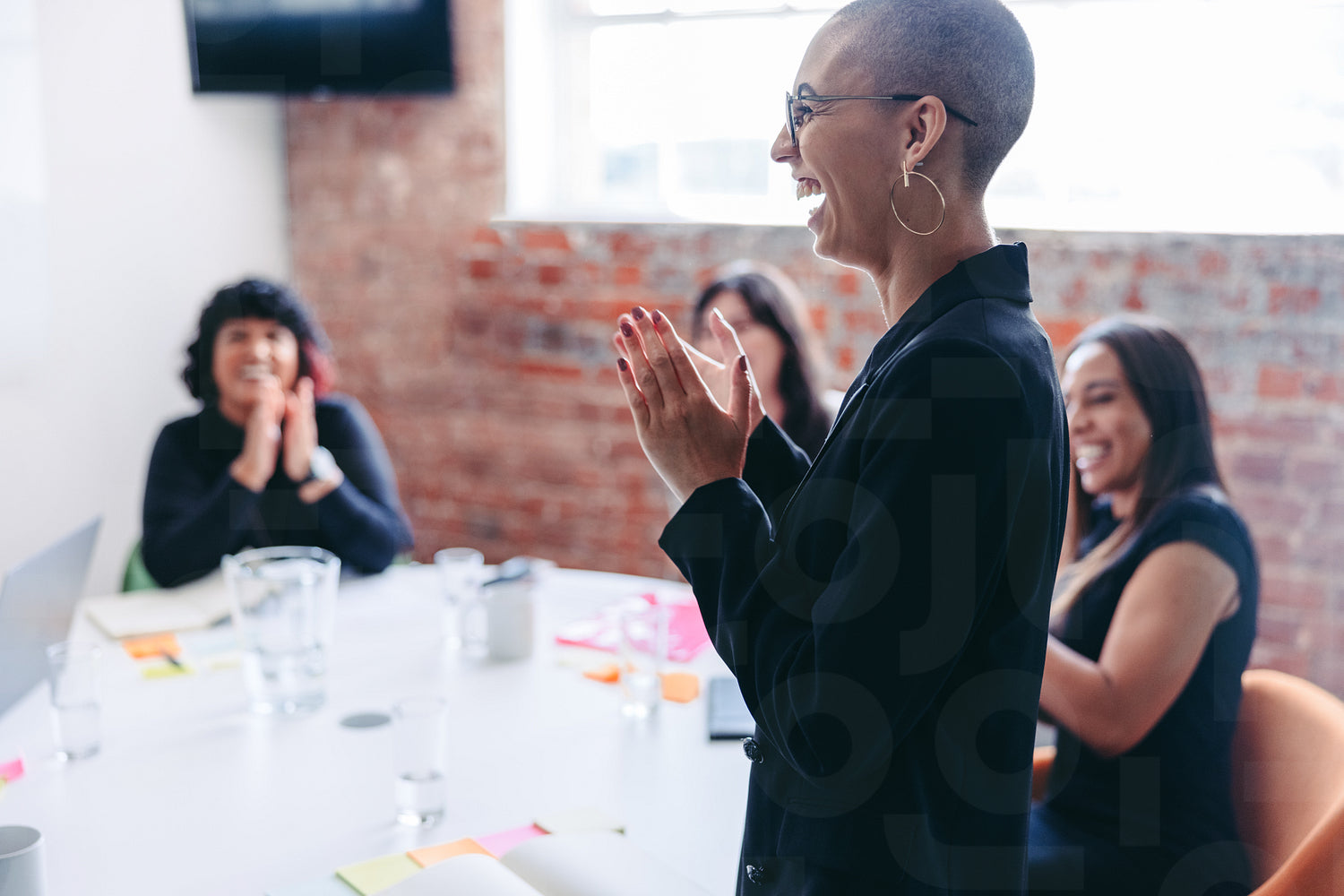 Cheerful businesswoman being applauded by her team during a meeting in a modern office. Happy young businesswoman smiling while receiving praise from her colleagues for her success.