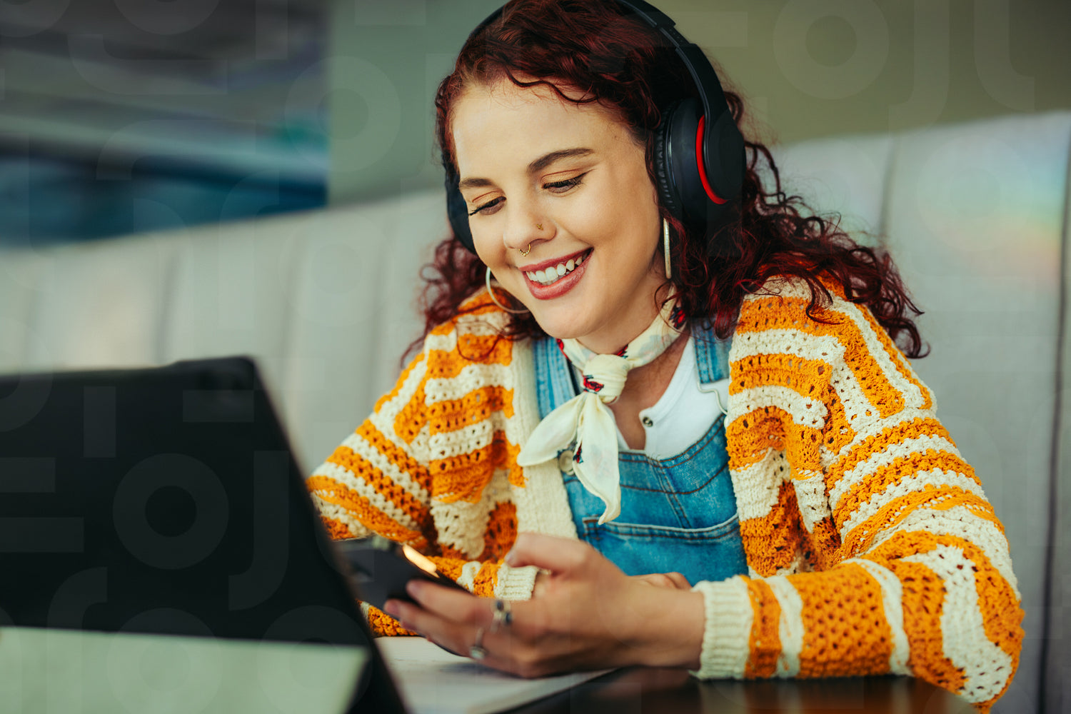A smiling female college student wearing headphones, studying online with a smartphone and laptop at a cozy cafe. Emphasizes modern education, technology, and youth lifestyle.