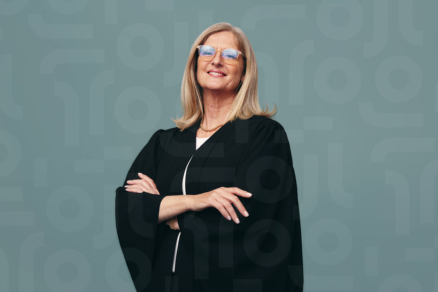 Cheerful female smiling at the camera while standing with her arms crossed in a studio. Happy mature judge wearing her gown against a studio background.