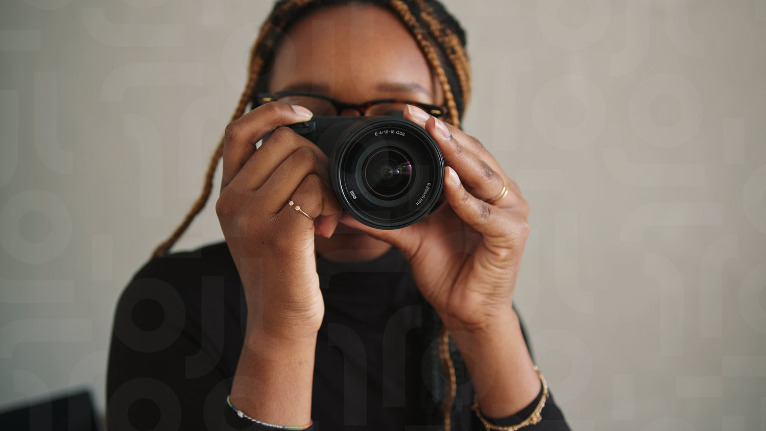 Cheerful female photographer capturing pictures with a dslr camera. Creative young woman smiling happily while using a camera in her home studio.