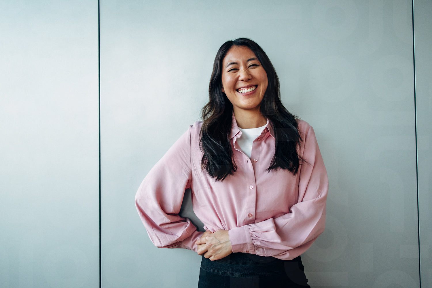 Portrait of a happy businesswoman standing against a wall. Female professional in casuals looking at camera and smiling.
