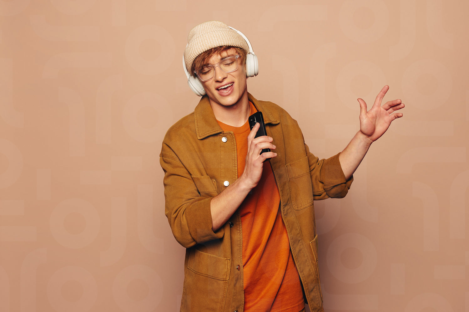 Fashionable young man stands against a vibrant peach background, holding a smartphone and wearing casual clothing. With headphones on, he sings along to music, exuding fun and happiness.