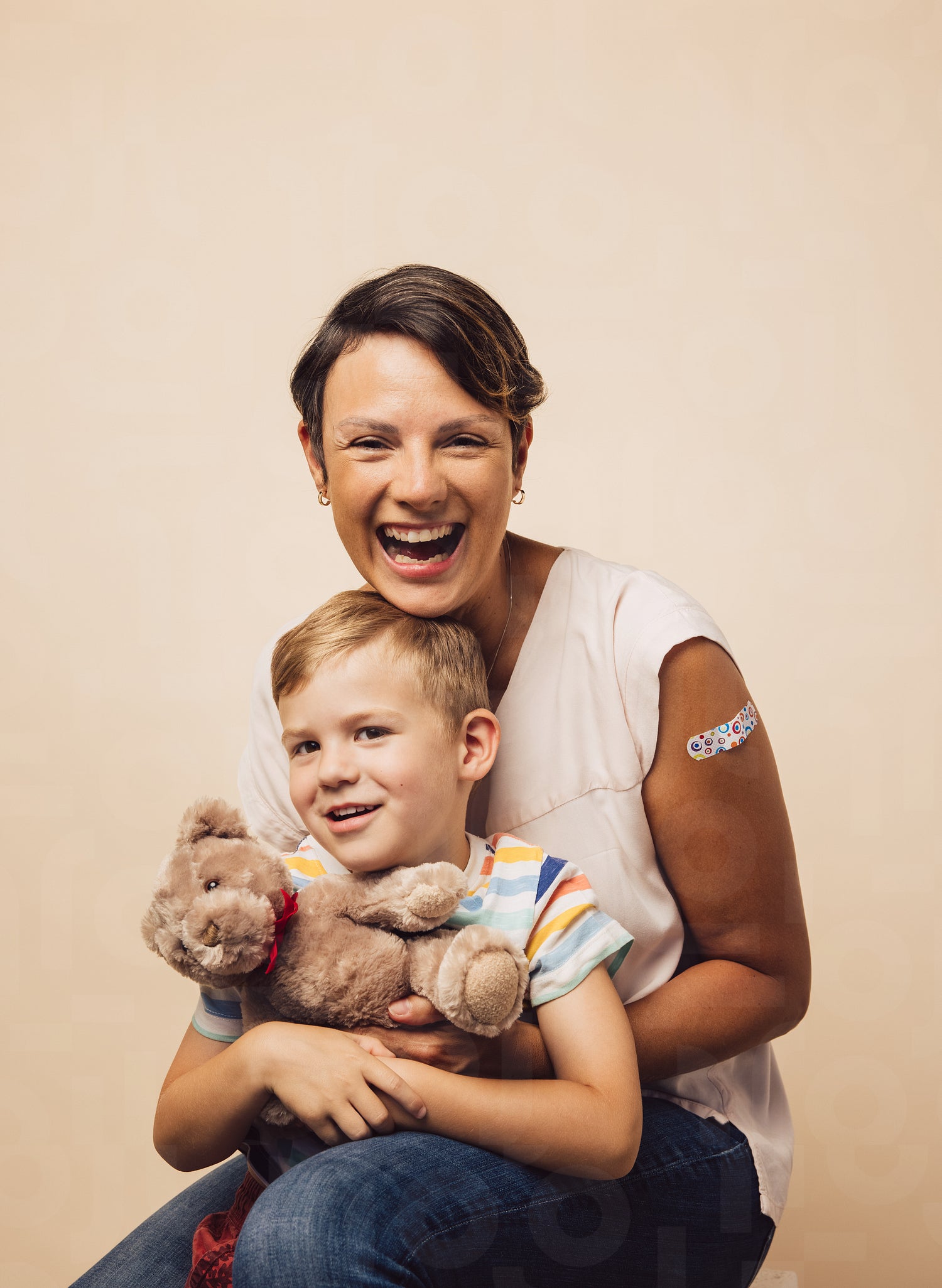 Cheerful mother and son after vaccination on brown background. Woman holding her son with a teddybear.