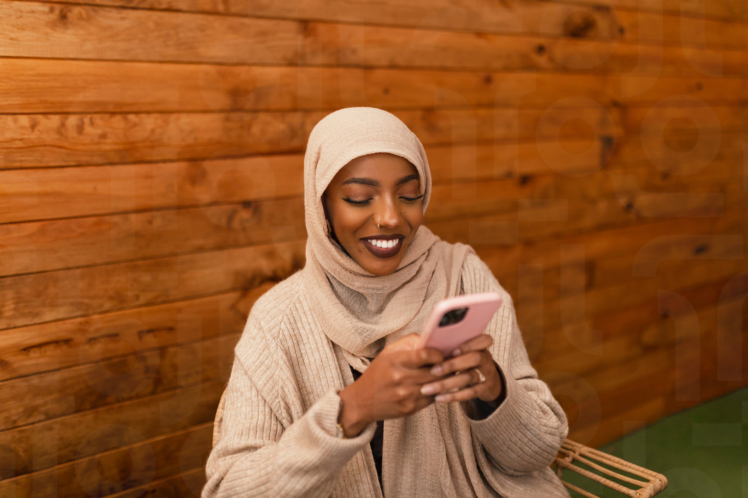 Cheerful muslim woman sending a text message while sitting in a restaurant. Happy young muslim woman smiling excitedly while using her smartphone. Carefree young woman having fun in a cafe.