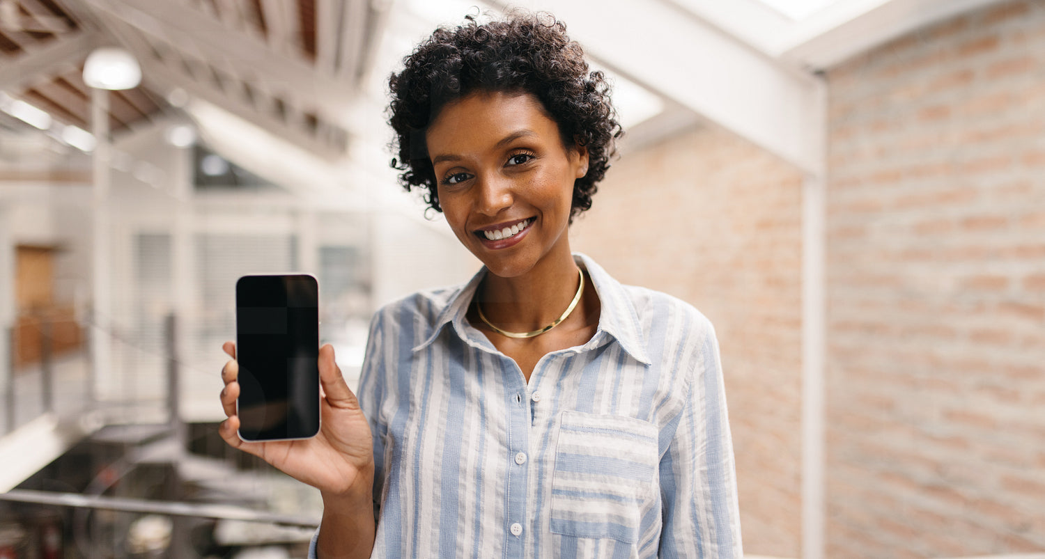 Cheerful small business owner smiling at the camera while showing a smartphone. Female entrepreneur managing her business using a mobile app. Happy young businesswoman running an online startup.