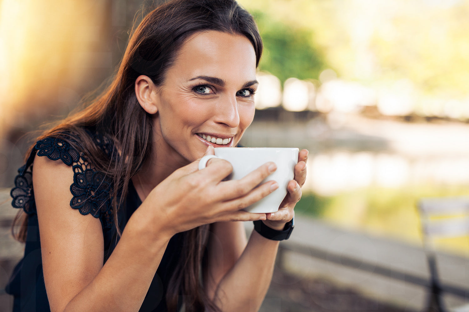 Beautiful young woman holding a cup of coffee looking at camera smiling. Cheerful female enjoying a cup coffee at cafe.