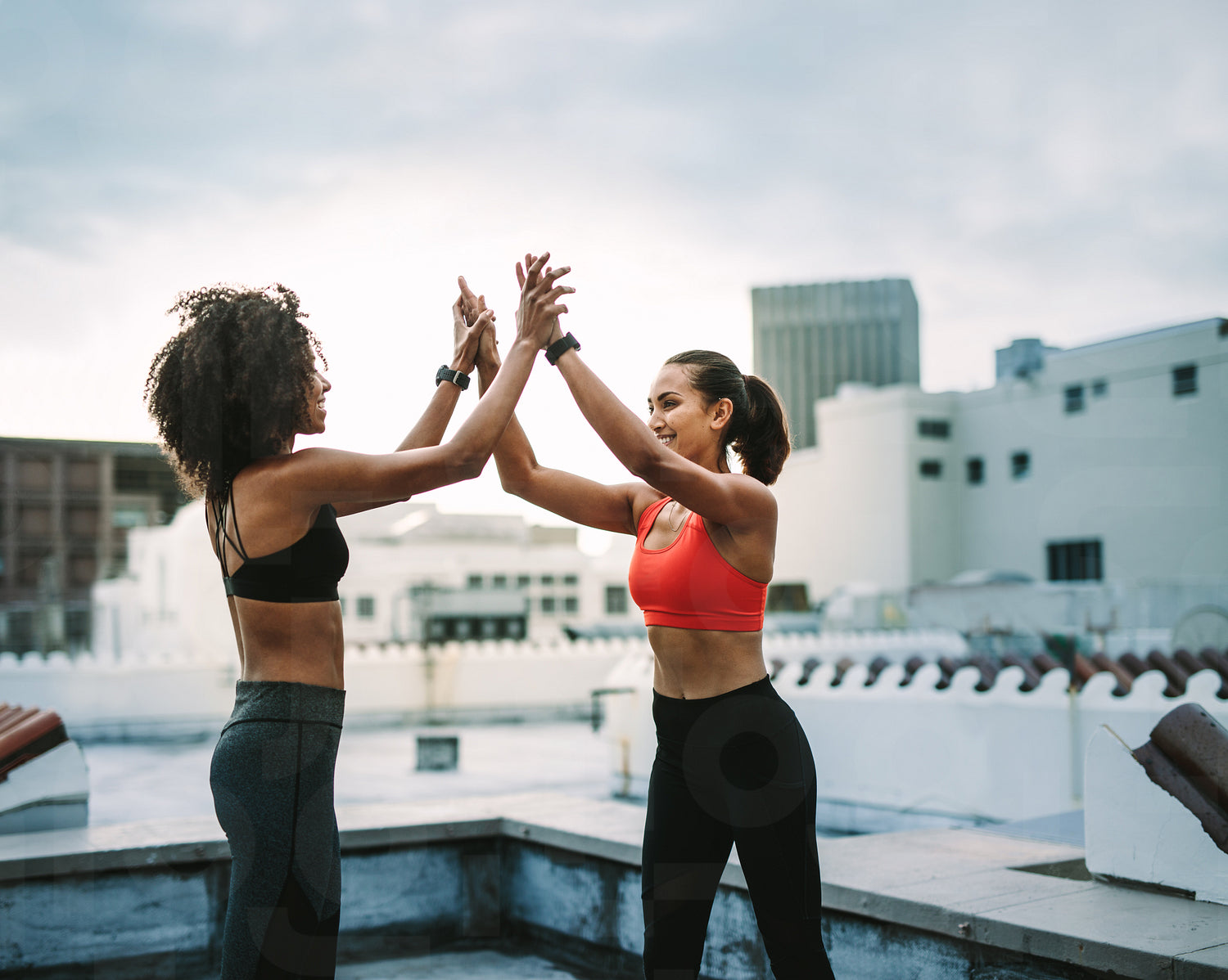 Two fitness women celebrating by giving high five after workout. Fitness women enjoying their workout on rooftop giving high five with both hands.