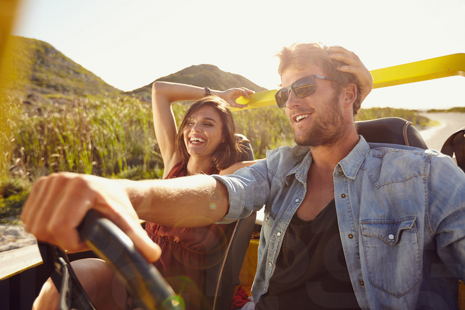 Cheerful young couple on road trip. Young man driving open topped car with woman smiling.