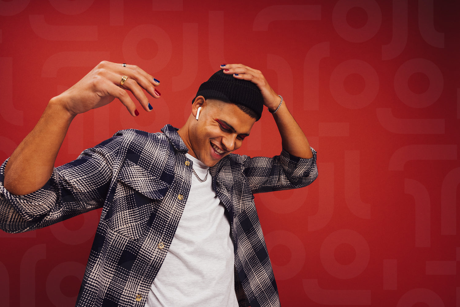 Cheerful young man enjoying his favourite music in a studio. Happy young man smiling while wearing wireless earphones. Handsome young man dancing while standing against a red background.