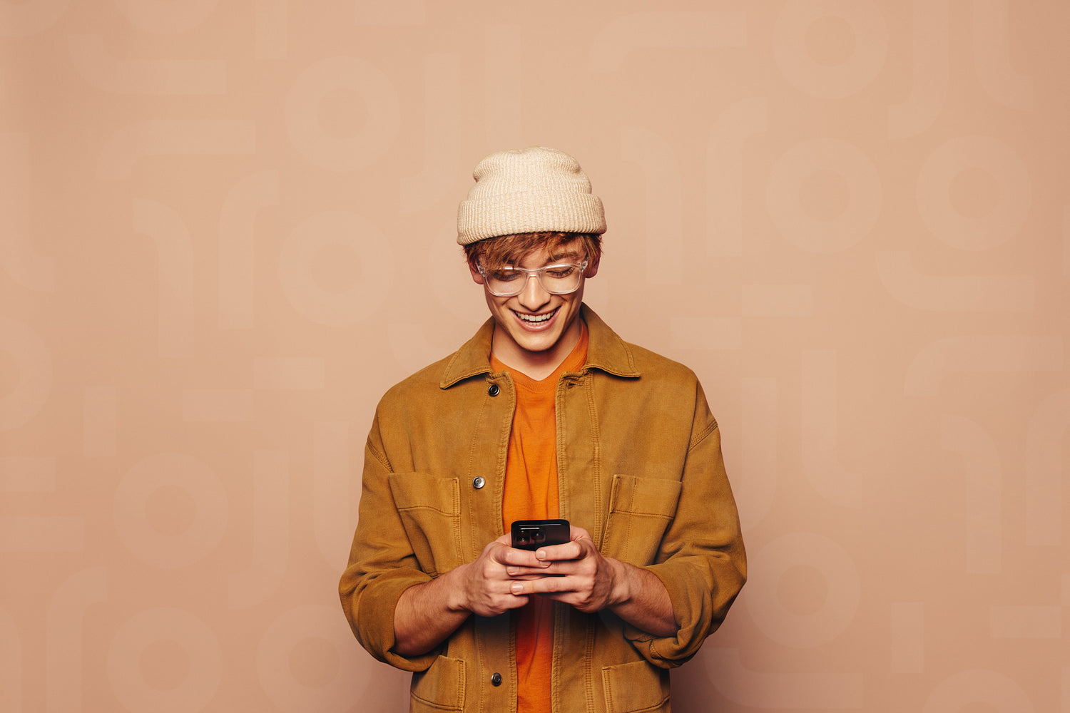 Young man in casual clothing and a denim jacket stands against a peach background. Holding a mobile phone, he smiles while reading and using social media. His modern glasses add a touch of trendy style to his vibrant lifestyle.