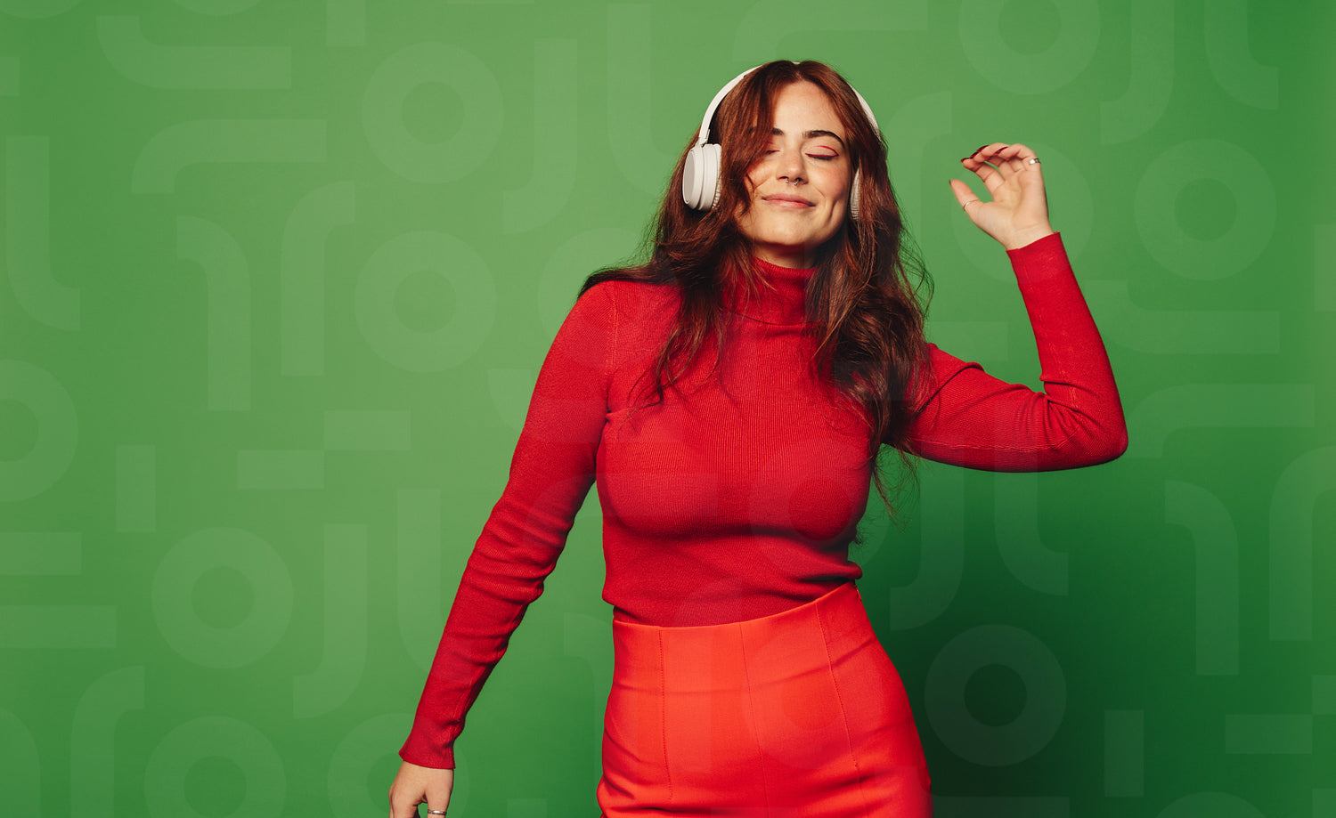 Young woman in casual sweater stands on a green background listening to music through wireless headphones. She moves and dances to the beat with a cheerful smile, bringing fun and vibrant energy to this modern lifestyle image.