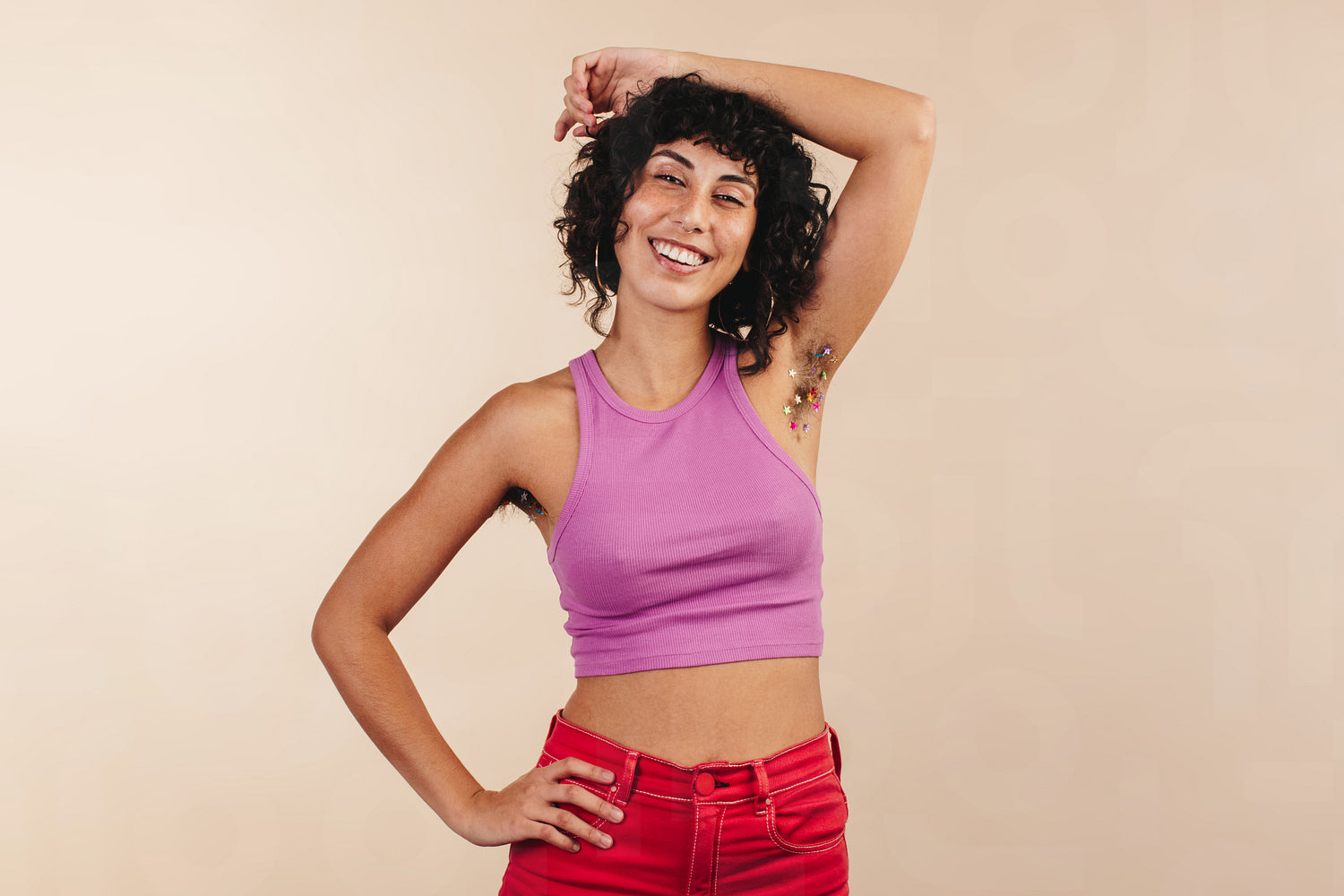 Cheerful young woman smiling at the camera while flaunting her confetti-decorated underarm hair. Happy young woman making the choice not to shave. Body positive young woman embracing her natural body.
