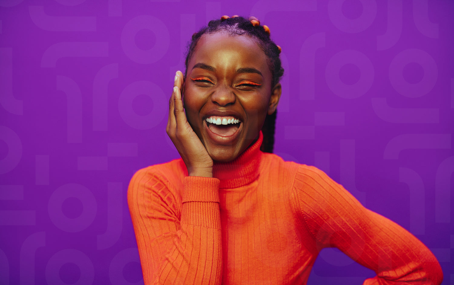 Cheerful young woman with stylish braided hair and vibrant purple background