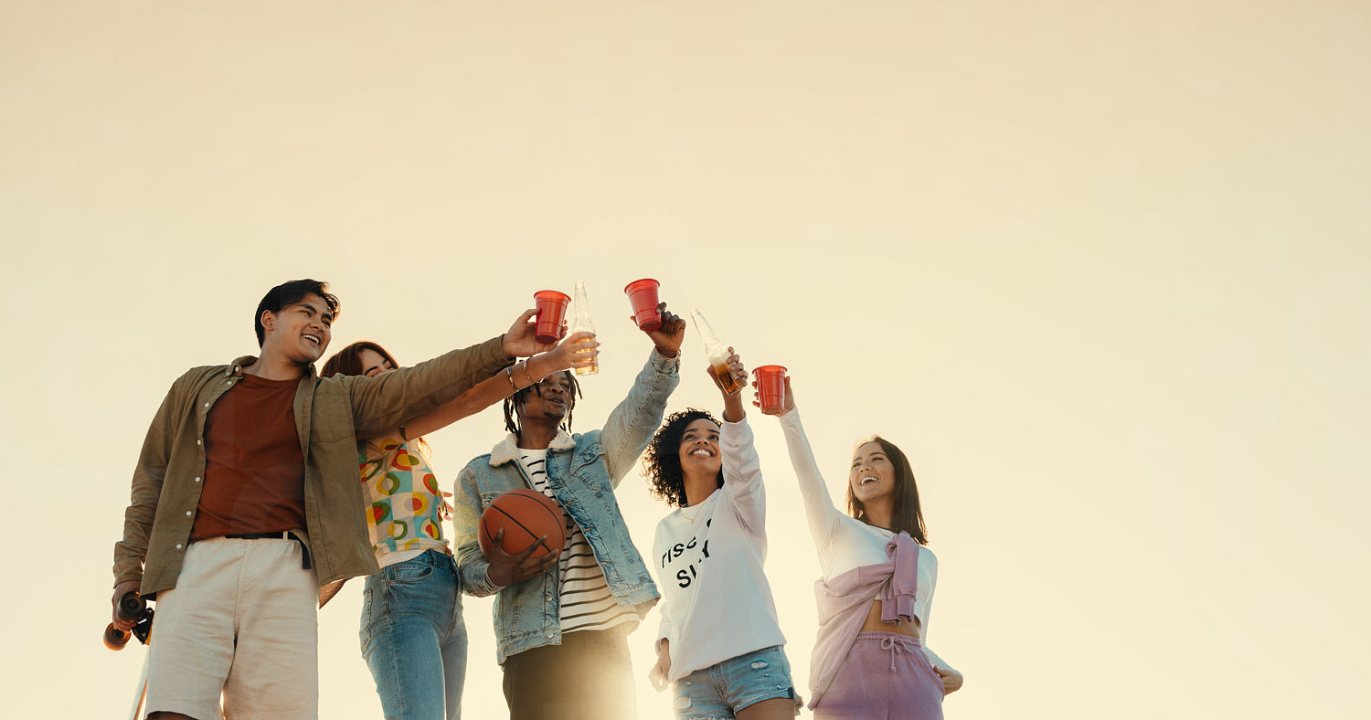 Cheering friends having a fun outdoor gathering, holding drinks and smiling