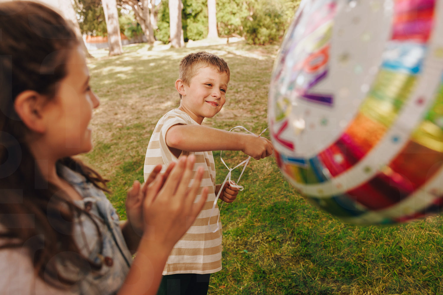 Two children enjoying an outdoor birthday celebration with a vibrant balloon and playful spirit in a sunny garden. This photo radiates happiness, youthful energy, and the joy of shared moments.