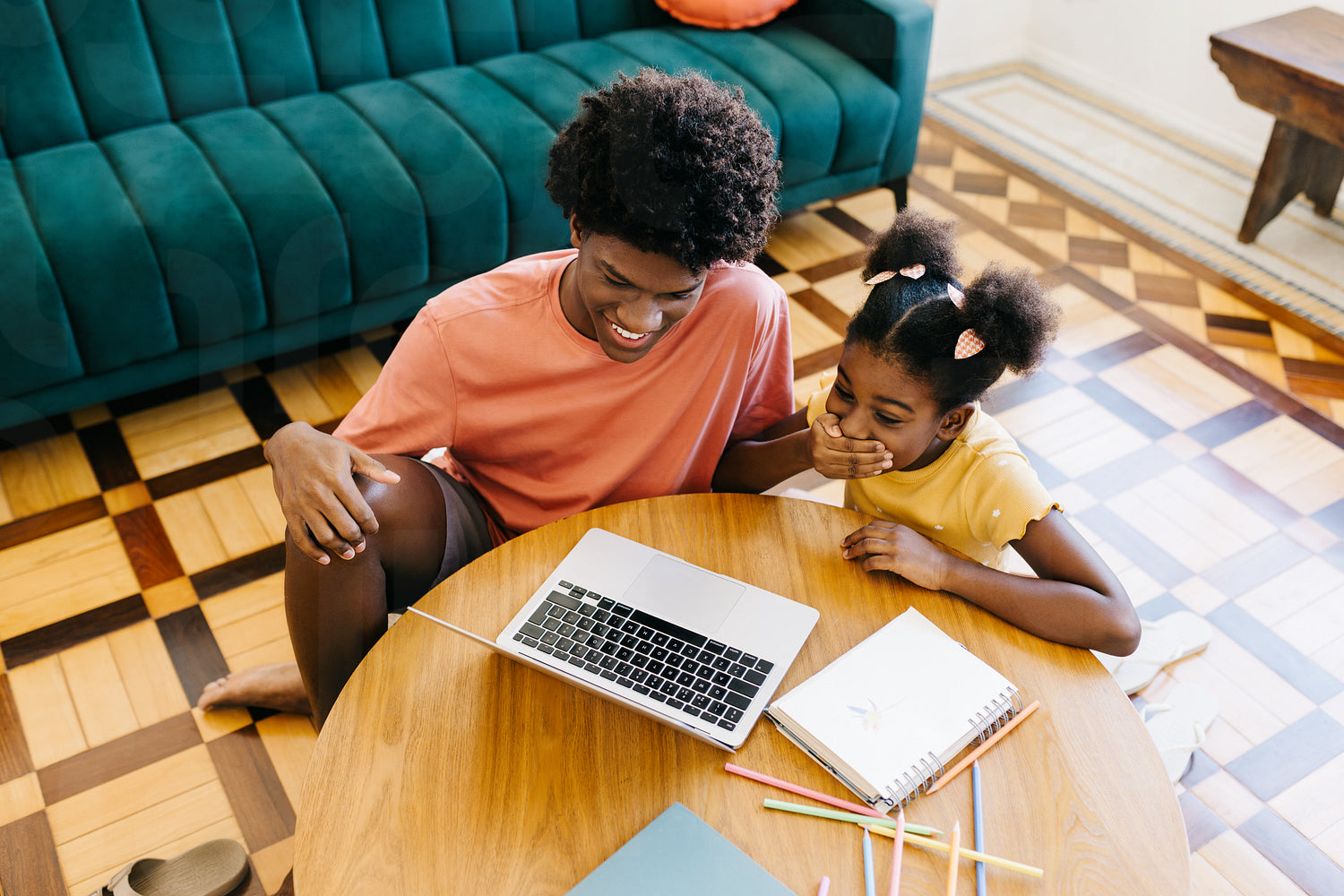 Black children learning together at home, using a laptop for online learning. Teenage boy and his younger sister studying happily, watching an educational and entertaining tutorial video.