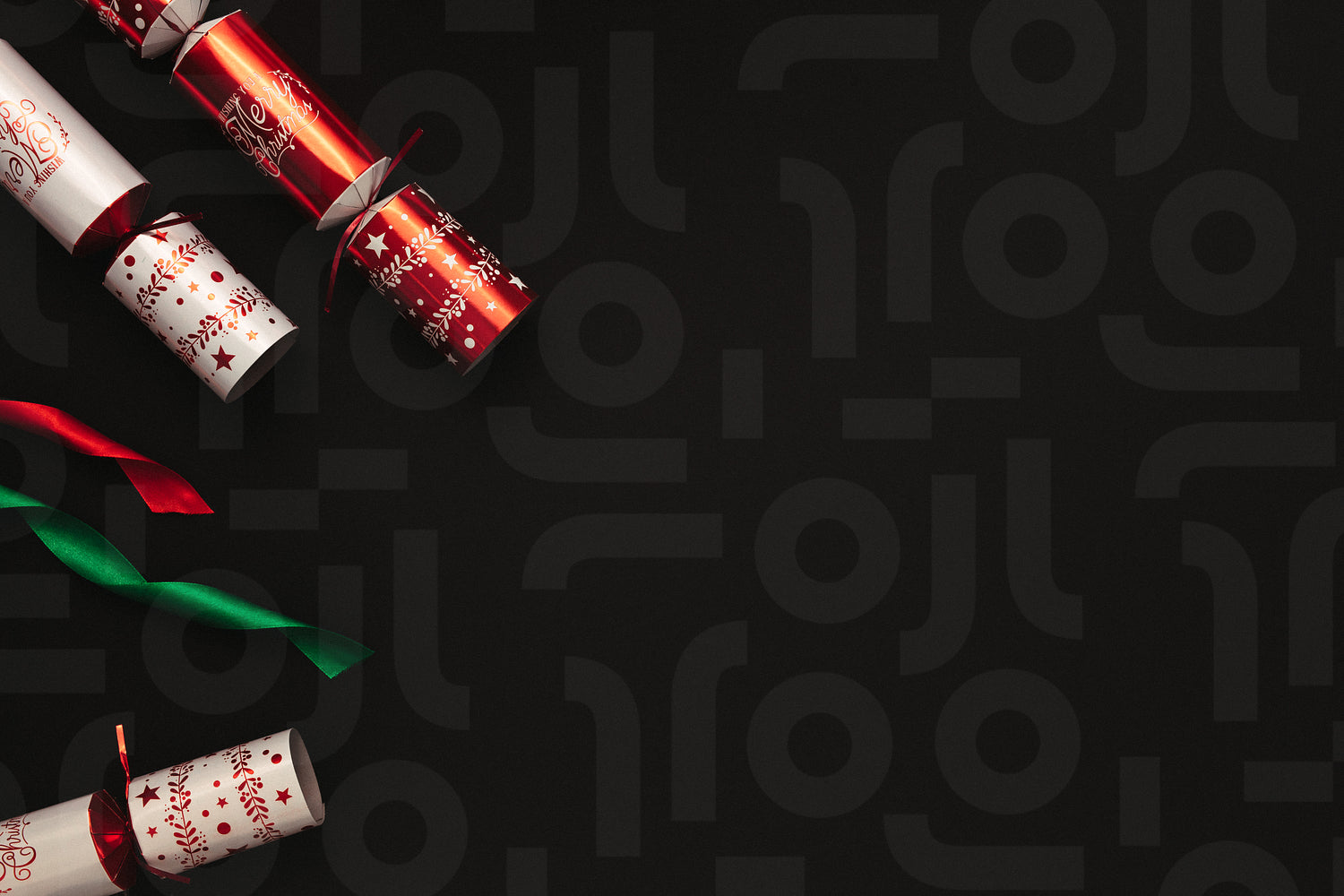 Christmas crackers with ribbons placed on black background with copy space. Directly above shot of colorful crackers with lots of copy space.