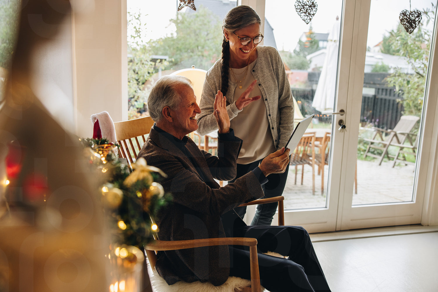 Senior couple using digital tablet for video calling their family on a Christmas day. Senior man and woman having a video call.