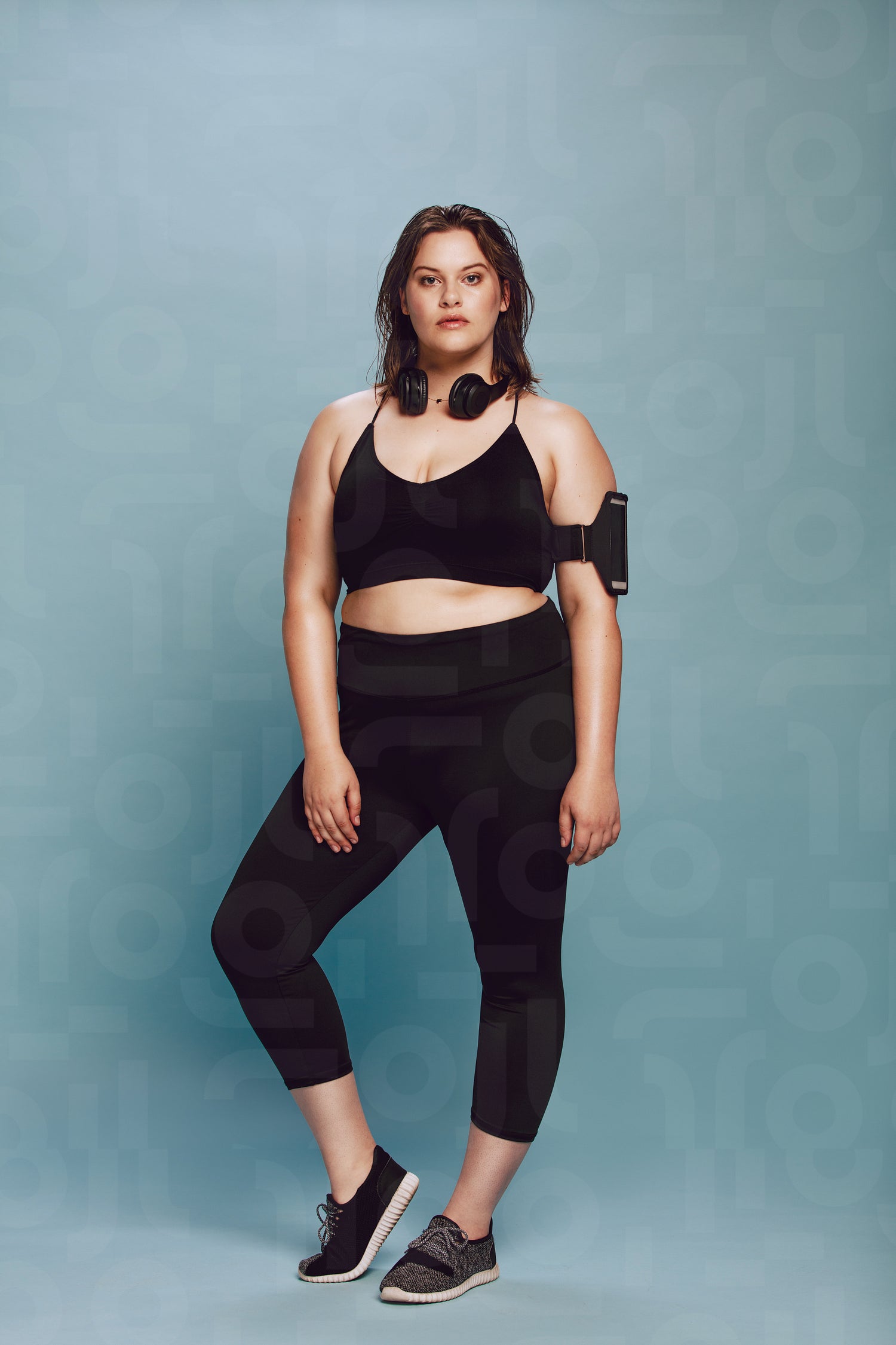 Over weight women in sportswear standing over grey background. Caucasian woman in fitness outfit looking at camera.