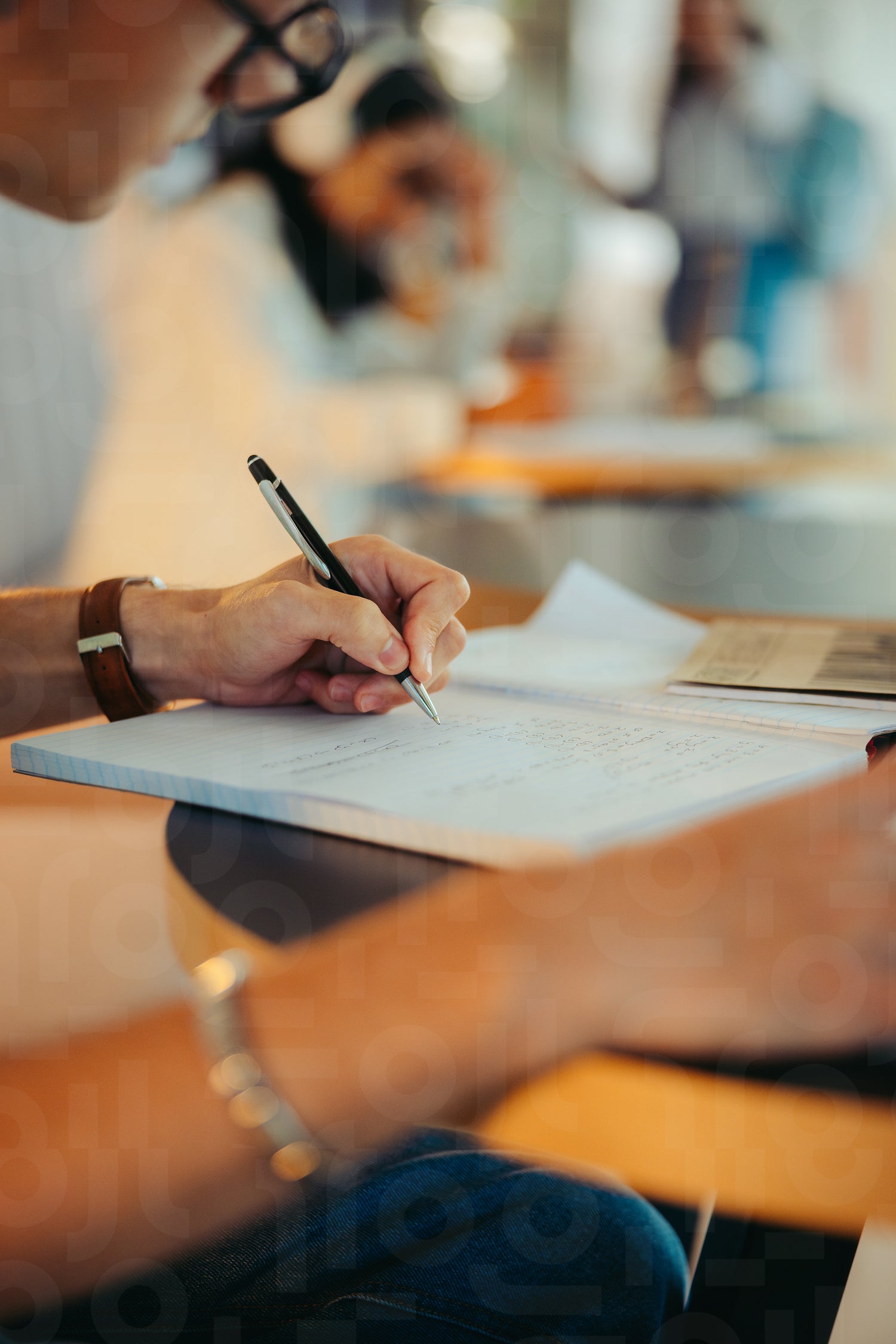 Close-up of a person writing homework assignment in a notebook at a desk with focus on hand and pen