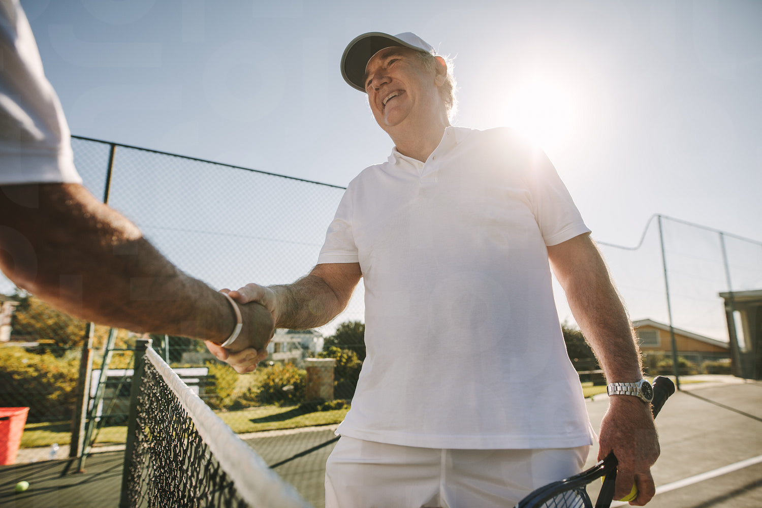 Senior man shaking hands standing on tennis court. Tennis player greeting his opponent standing near the net with sun in the background.