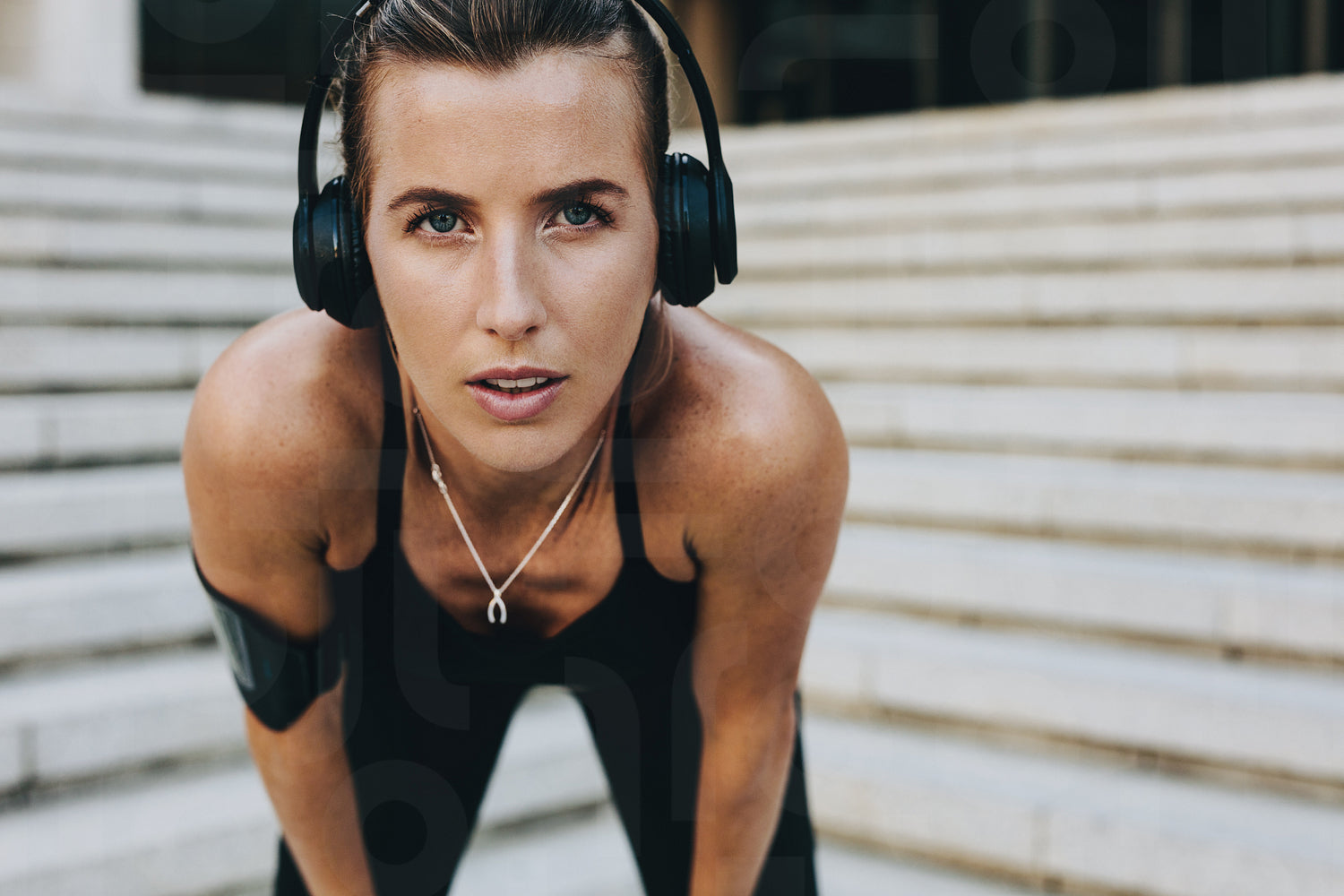 Fitness woman training outdoors bending forward with hands on knees. Fitness woman wearing wireless headphones relaxing while training.