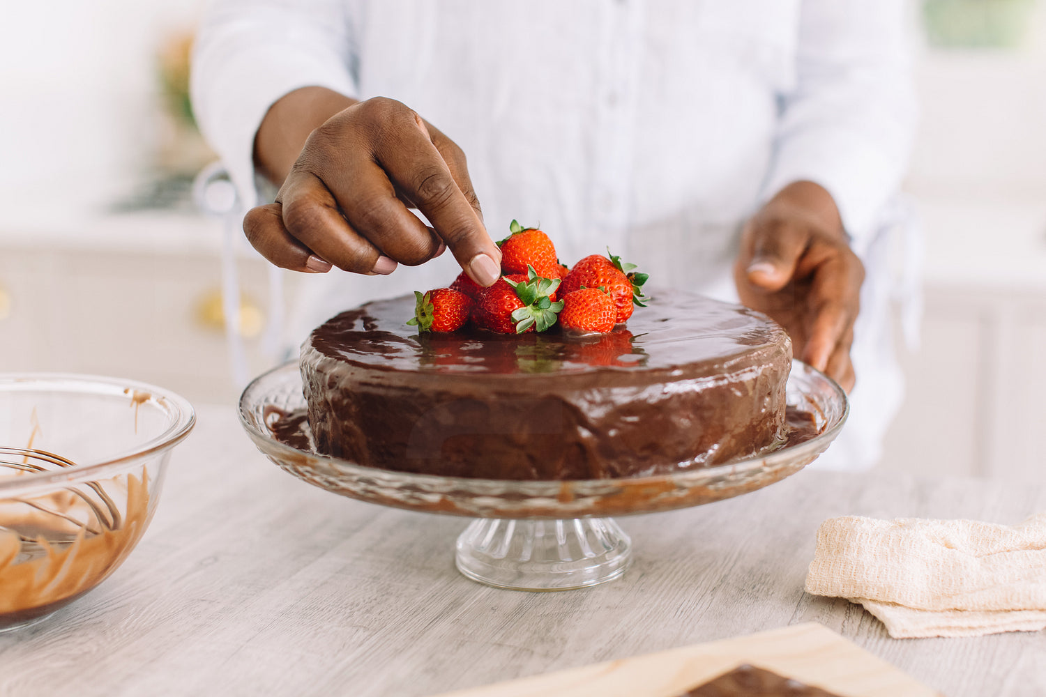 Close-up of a female hand decorating chocolate with strawberries in kitchen. Cake on glass standing with woman decorating it.