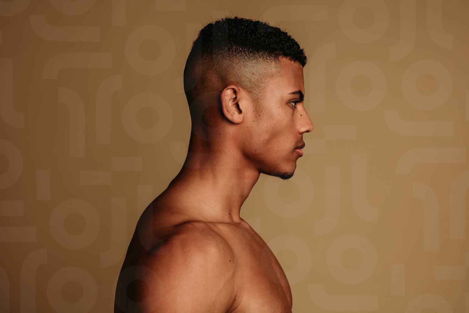 Side view of african american man standing on brown background. Portrait of shirtless muscular man with short hair.