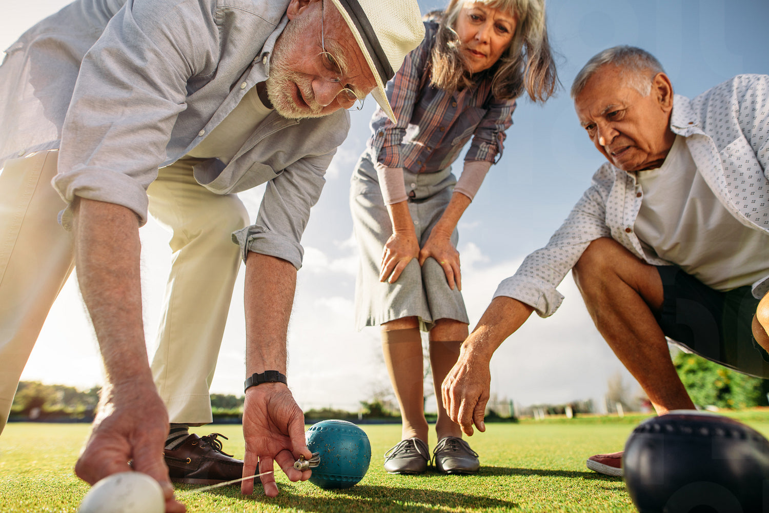 Low angle shot of two senior men and a woman looking at the position of the boules. Senior persons measuring the boules to the jack to see the result of the game.