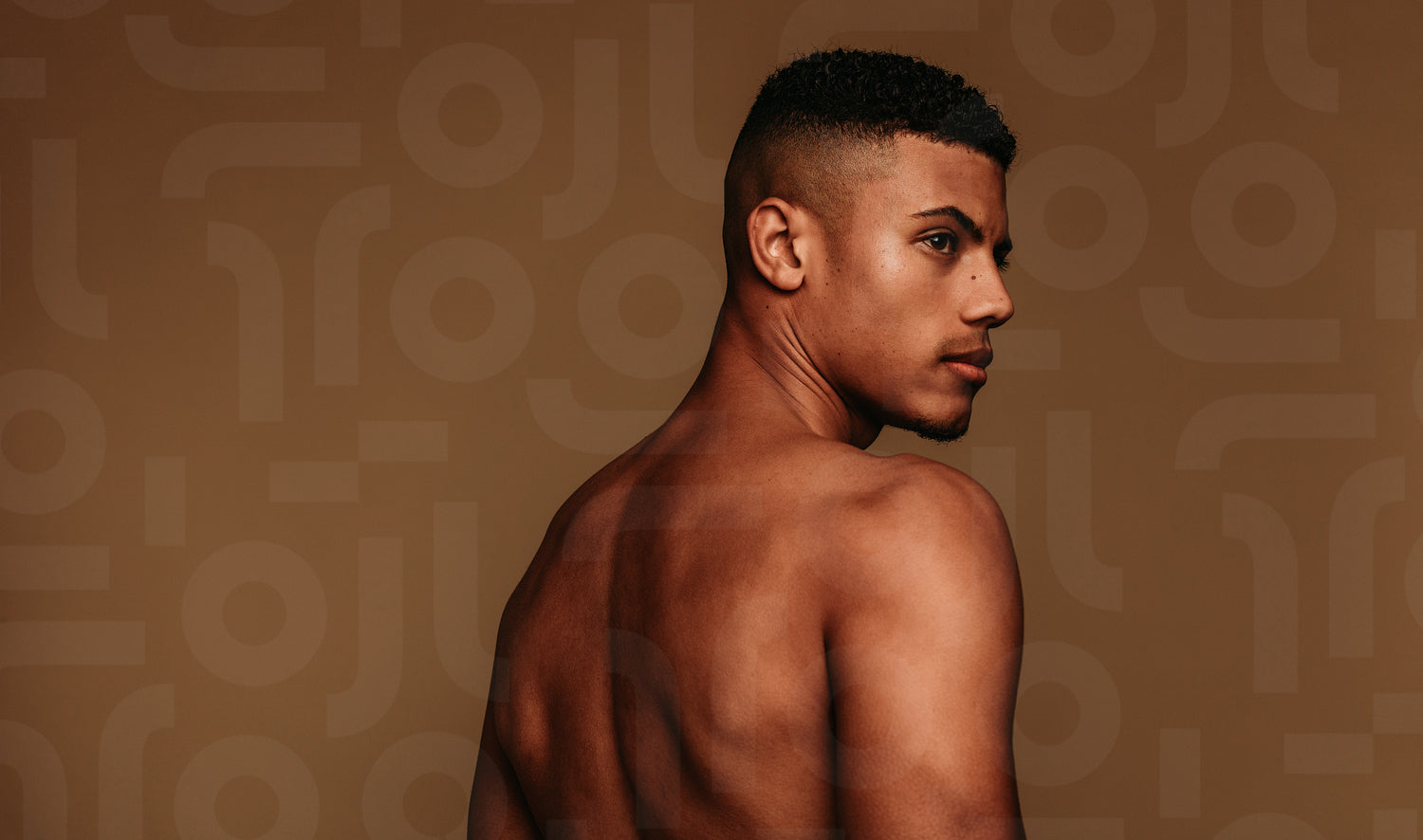 Portrait of shirtless muscular man looking away. Side view of african american man standing on brown background.