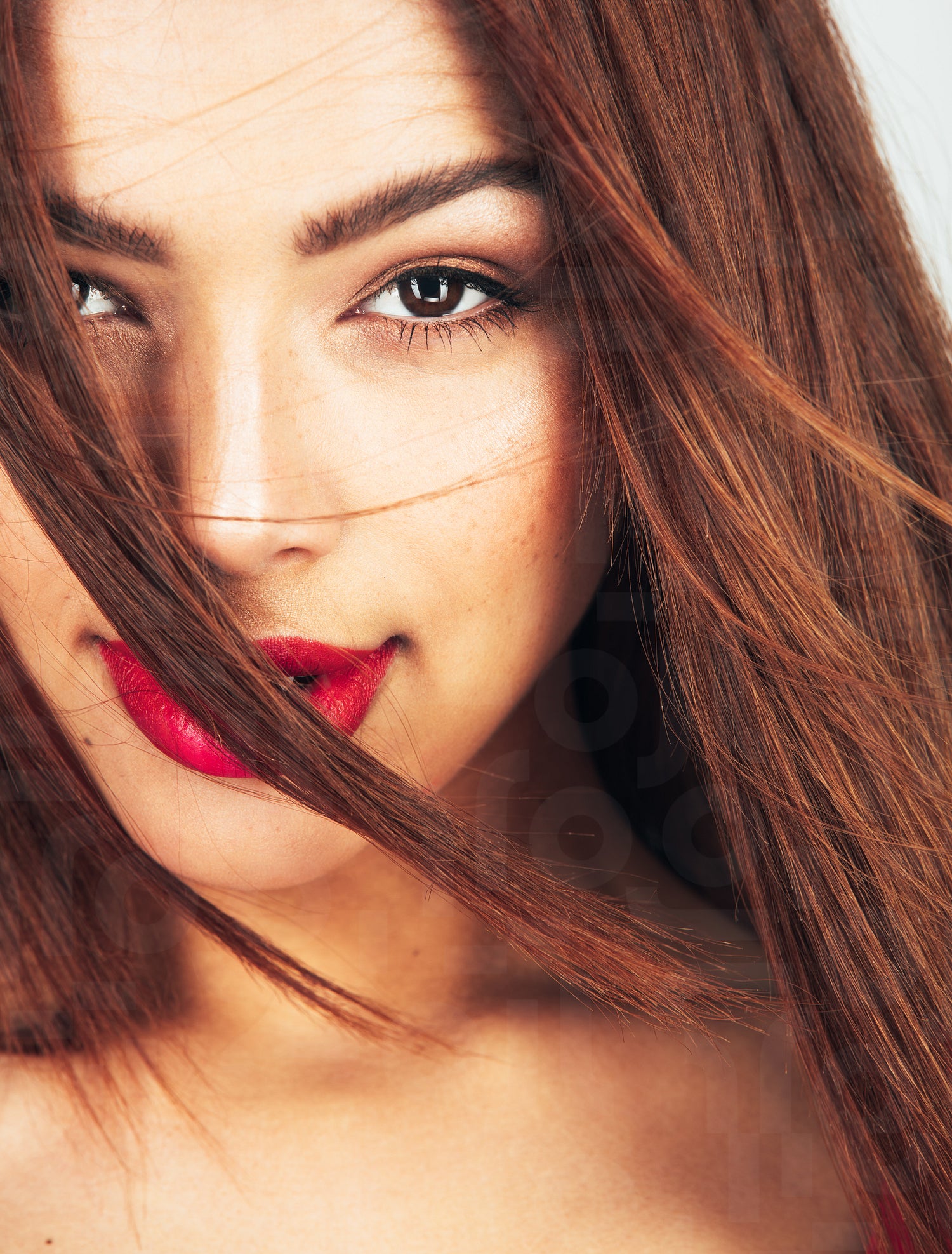 Close up of a woman with clear face and a sensual look. Fashion woman posing for photo with her brown hair falling across the face.