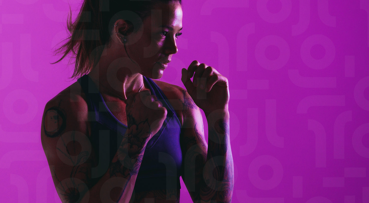 Close up portrait of fit woman on purple background