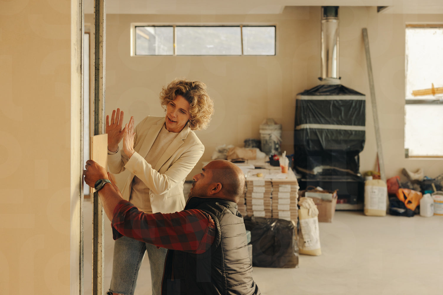 Collaborating on home renovation: Professional worker and homeowner discussing interior remodeling for a house