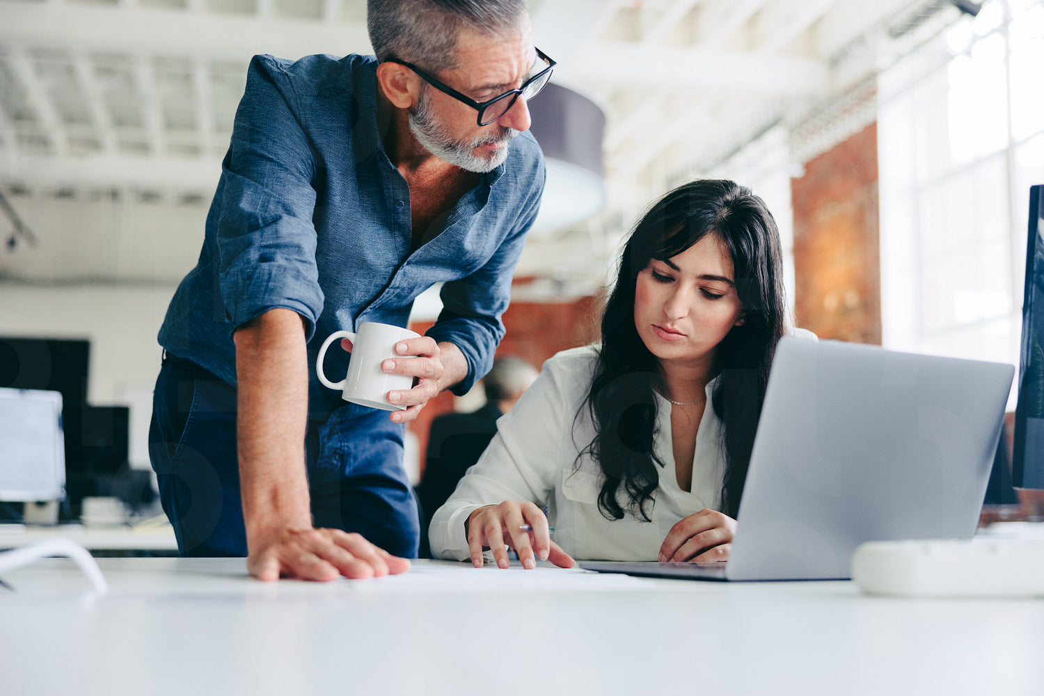 Collaborating on the latest project. Focused mature businessman teaming up with his female colleague in a modern office. Two colleagues having a discussion while going through some paperwork.